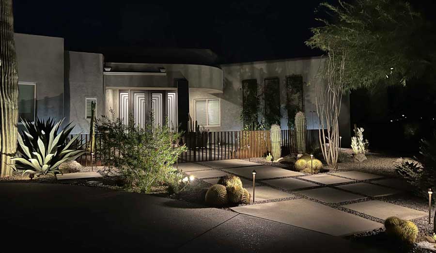 Yes, we love how night lighting design can create amazing focal points in your landscape. We love that lighting can highlight amazing plants like Saguaro, columnar specimen succulents, the canopy of trees, and highlight architecture. Safety lighting is always important too! Please look at our projects page to see how lighting makes such an amazing difference at night!
